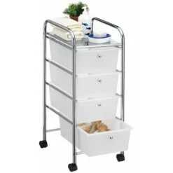 … est une solution de rangement très pratique et utile au quotidien. Les 4 tiroirs en plastique blanc transparent vous permettent de ranger toutes vos affaires à l’abri, et les roulettes facilitent le déplacement de ce petit meuble où que vous en ayez besoin. Une tablette est également à votre disposition pour y déposer quelques objets du quotidien à portée de main. Ce caisson en métal chromé peut aussi bien servir de rangement complémentaire sous un bureau pour y ranger des documents ou vos fournitures, dans une chambre pour les jeux et jouets de votre enfant, dans la cuisine pour vos ustensiles ou bien dans la salle de bain pour vos cosmétiques, shampooings, gels douche, les serviettes, et bien plus encore !