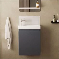 Le meuble lave-mains LISA,gris anthracite en finition laquée brillante en médium (MDF). La vasque est fabriquée en céramique blanche, vous pourrez décider de positionner la plage de robinetterie à gauche ou à droite