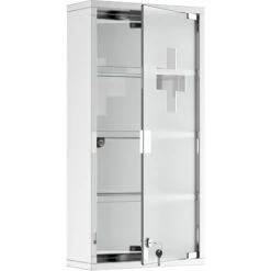Vous recherchez une solution design et pratique de rangement de vos médicaments ? Alors cette pharmacie murale sera idéale ! Très tendance avec sa porte en verre dépoli avec symbole croix, sa structure acier inoxydable, et équipée de 3 étagères, cette pharmacie vous sera d’une grande utilité au quotidien et pour de longues années.