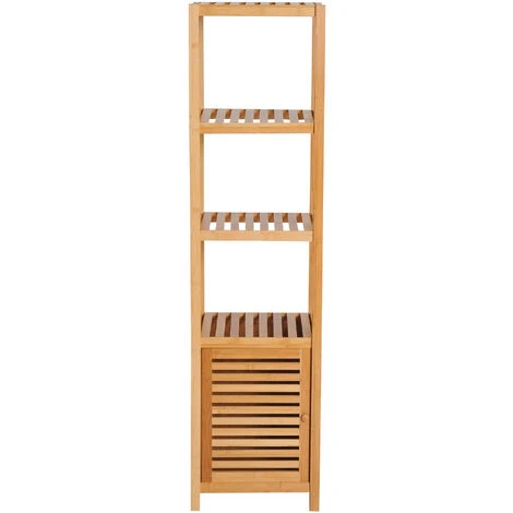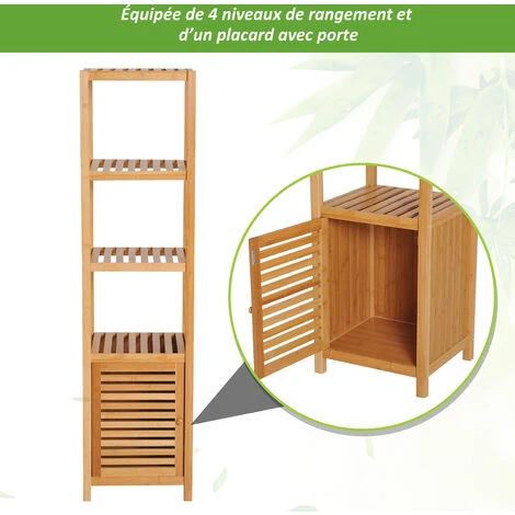 Ce magnifique meuble colonne de salle de bain en bambou équipé de 2 étagères 4 niveaux + placard ajoutera une touche cosy naturelle très tendance à votre pièce d’eau.