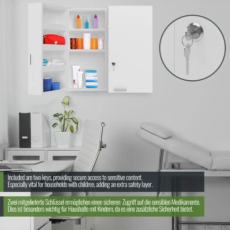 Rangez et sécurisez tous vos médicaments et autres produits pharmaceutiques grâce à cette armoire à pharmacie à 11 compartiments en acier. Le mécanisme de verrouillage est particulièrement important pour les familles avec enfants, car il offre une garantie de sécurité. Cette armoire peut être placé à la hauteur souhaitée dans la salle de bains, le couloir ou un autre chambre, car son montage mural est très simple.