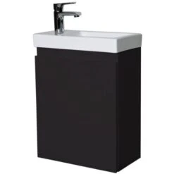 Mob in vous présente le meuble lave-mains noir carbone SKINO ! un choix pratique pour les petites pièces comme les WC et les salles d’eau. Il est équipé d’une vasque en résine de synthèse blanche avec un espace de rangement intégré pour maximiser l’espace. La porte réversible s’adapte à vos besoins, Sa finition noire est satinée,