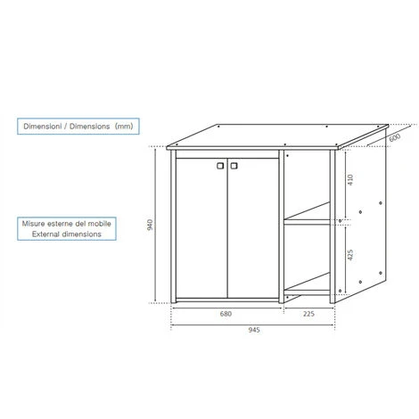 Ses dimensions sont : 94,5 cm de largeur, 94 cm de hauteur et 60 cm de profondeur.