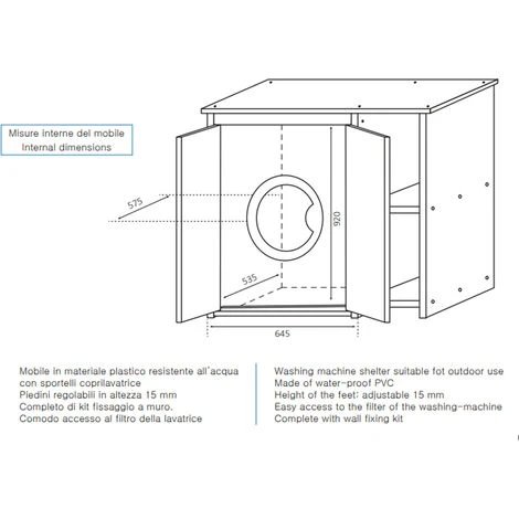 Complet avec pieds réglables (15 mm de haut), accès pratique au filtre de votre lave-linge .