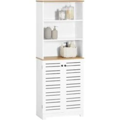 3 étagères ouvertes et 2 étagères réglable en hauteur derrière les portes sont pour des serviettes, papier toilette et autres ustensiles de salle de bain.