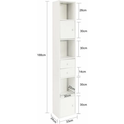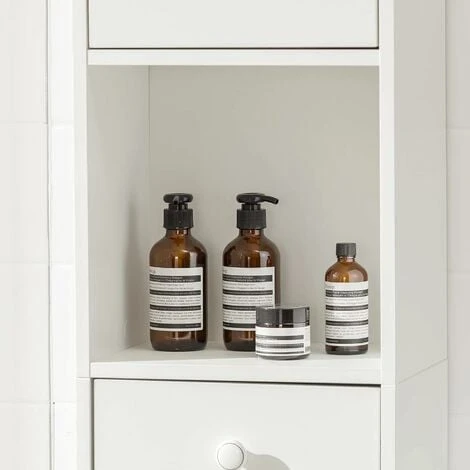 - 2 tiroirs, 2 portes et 3 étagères sont pour des serviettes, papier toilette et autres ustensiles de salle de bain.